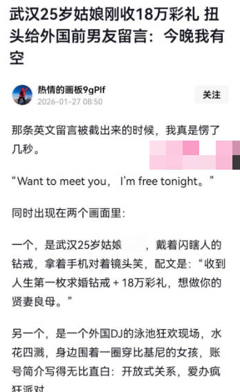 湖北武汉再曝媚黑大瓜!一名叫孟瑶的妹子,在网络平台上的一句圣诞快乐,引发了网友的热议,起因是这妹子与程序员未婚夫相恋7年,要了18万的彩礼,结果扭头就在网上晒自己贤妻良母的人设,不料被人扒出,还在一名英国DJ的评论区留言:今晚我有空。如此倒贴的行为,瞬间引发了网友们的轰动!